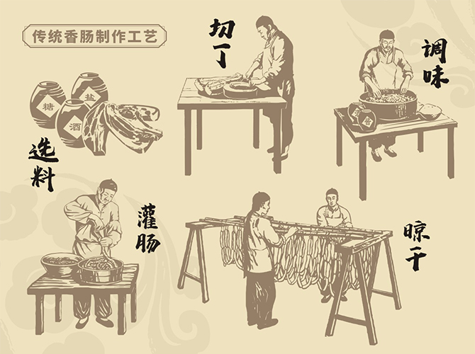 北魏·賈思勰《齊民要術(shù)》—灌腸法:“取羊盤腸,凈洗治。細銼羊肉,令如籠肉,細切蔥白、鹽、豉汁、姜、椒末調(diào)和,令咸淡適口,以灌腸。兩條夾而炙之。割食甚香美。”這是有據(jù)可查的最早關(guān)于香腸工藝的史料記載。