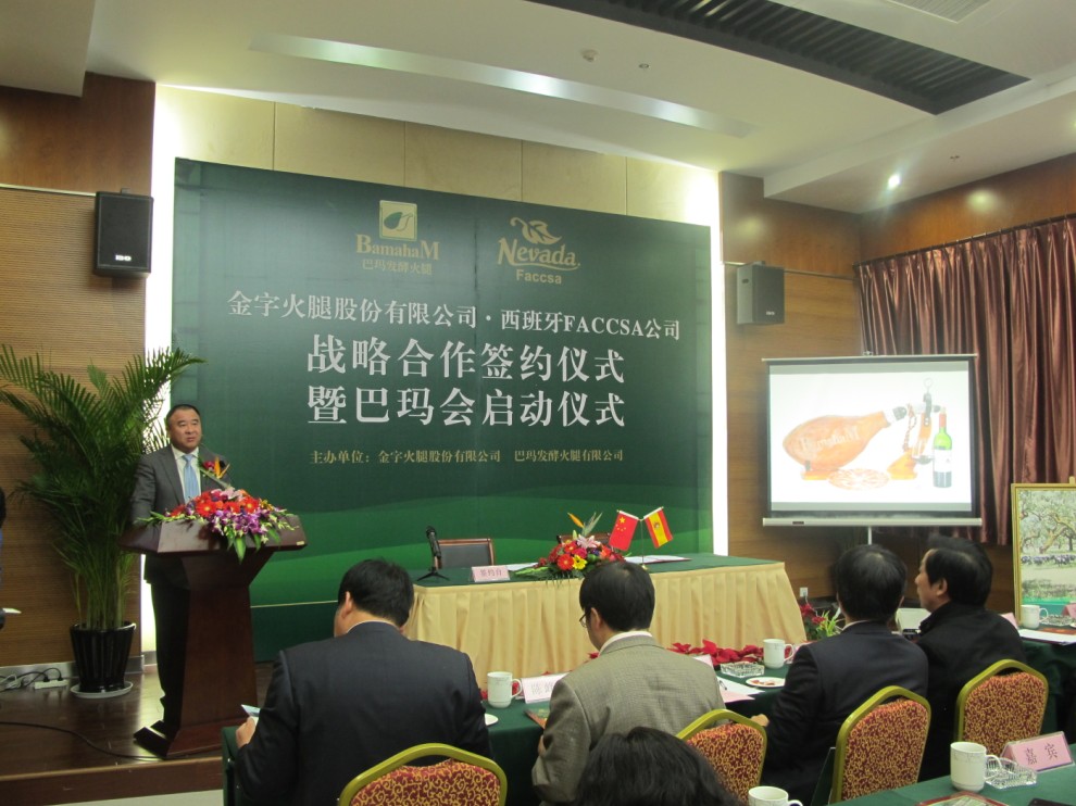 西班牙FACCSA公司負(fù)責(zé)人拉蒙先生在致辭中表示,發(fā)酵火腿在中國有巨大的市場空間,巴瑪火腿是中國發(fā)酵火腿的領(lǐng)軍品牌。雙方建立戰(zhàn)略合作關(guān)系,是企業(yè)發(fā)展需要,也是優(yōu)勢互補的最佳選擇。今后,雙方要整合資源,加強交流,深化合作,努力把兩個企業(yè)的合作打造成中西兩國經(jīng)貿(mào)合作的典范。