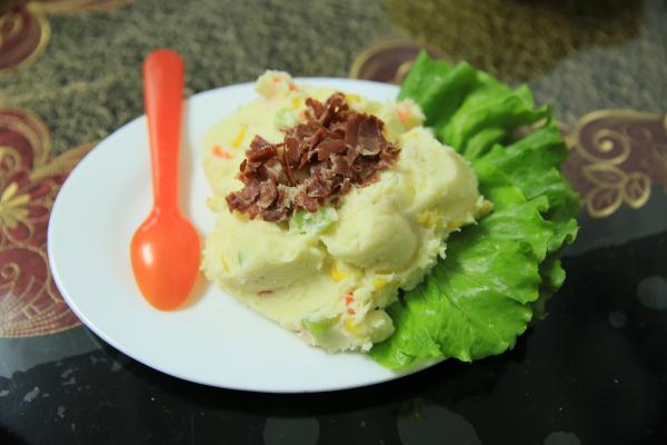 點(diǎn)評:土豆泥很細(xì)膩,加入了玉米、黃瓜和胡蘿卜之后,不光色彩搶眼,而且營養(yǎng)豐富。火腿和沙拉醬的組合,更是讓整道菜帶點(diǎn)淡淡的甜和淡淡的咸鮮,又奶香味十足,非常適合老人孩子食用。