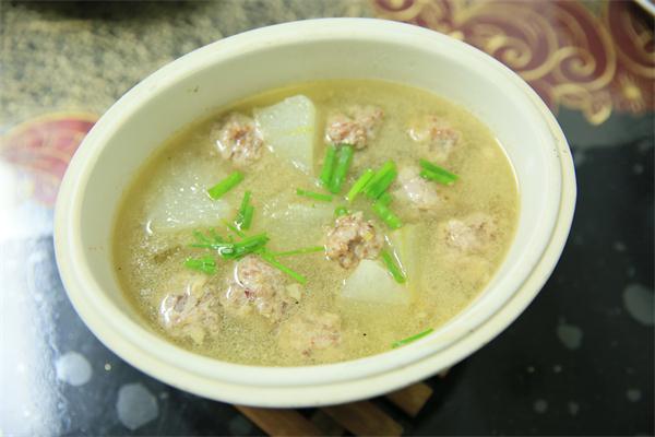 制作方法:夾心肉洗凈、剁碎,火腿切丁,生姜切末,備用;將上述材料混合,加入適量鹽、糖和料酒,再加入一個(gè)蛋清,用手混合均勻,再反復(fù)摔打至少10分鐘,至肉有彈性,再捏成大小適宜的小球,備用;豬大骨熬湯,備用;冬瓜洗干凈、切片,起油鍋略炒,加入大骨湯,燒開后逐一放入肉丸,再根據(jù)個(gè)人口味加入鹽等調(diào)味料,待肉丸燒熟即可起鍋。